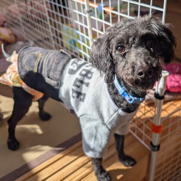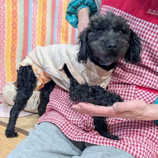 | 特徴(性格など) | 【仮名】 アルケス 【犬種】 トイプードル 【カラー】 ブラック 【体重】 3.0キロ 【性格】 明るく人懐っこくて、お膝の上が大好きな甘えん坊です。 人のそばにいるのが大好きで、いかにもプードルというタイプの子です。 穏やかなので、他のわんことも上手に過ごせます。 【ご飯】 油分が多いご飯は合わないようなので、消化器サポートと通常のドライをミックスしたフードをメインに、煮野菜や鶏肉などをトッピングしています。 食欲旺盛でなんでもよく食べます。 痩せているのでデブエットしています。 【お散歩】 上手に歩けます。 【お留守番】 フリーでしています。 【トイレ】 練習中ですが、少しずつシートを認識していきているようです。 【その他】 現在、特に治療中の疾患はありません。元気な子です。 |