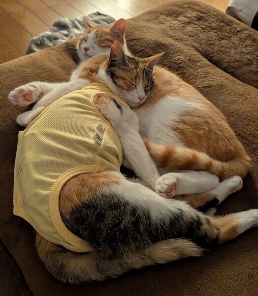 | 特徴(性格など) | お兄ちゃん:茶トラでとってもフレンドリーです。ふと気がつくと足元で「撫でて〜」とゴロンします。 妹ちゃん:三毛でお兄ちゃんよりは警戒心がありますが、保護して2ヶ月たった今では、お兄ちゃん同様、「撫でて〜」とゴロンします。 とにかく、2匹とっても仲良しで遊ぶ時はもちろん、寝る時もいつも一緒です。これからもずっと一緒にいて欲しいので、2匹一緒でお迎えしていただく事が1番の条件です。 |