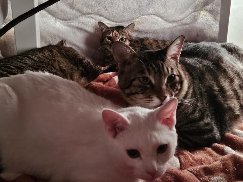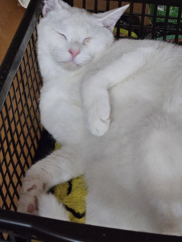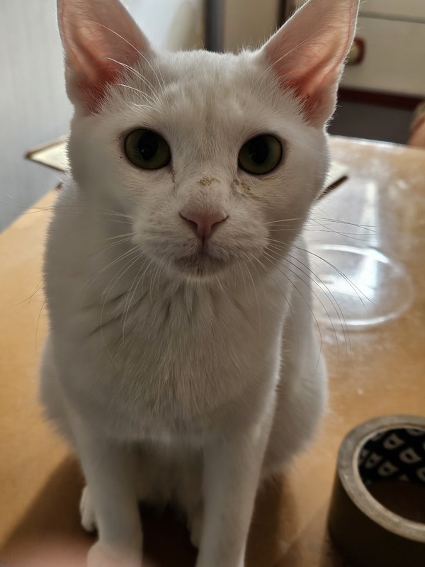 | 特徴(性格など) | 白猫で頭付近に数本黒が入ってます。 わんぱくで食い意地張ってます。 ボールを投げると犬みたいに咥えて持ってきます。 |