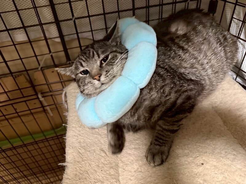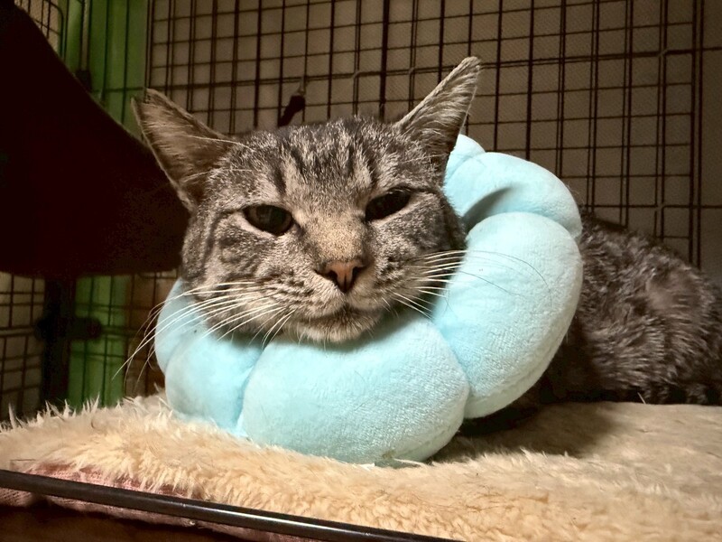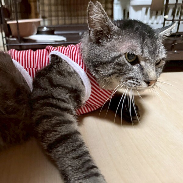 | 里親募集する理由 | TNR後お庭でお世話をしていましたが、新入りの未去勢猫とケンカをし、 傷だらけになってしまったため室内保護に切り替えました。 現在、ケンカ傷の治療中ですが、薬を舐めたり、 傷を舐め壊してしまうためエリザベスカラーや服を着せています。 |