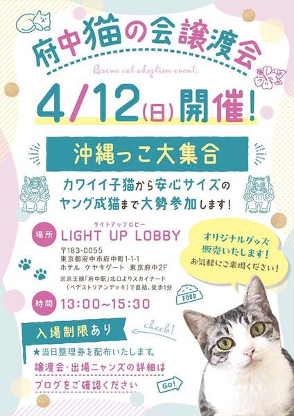 | その他(譲渡条件など) | ୨୧⌒⌒⌒⌒⌒⌒⌒⌒⌒⌒⌒⌒⌒⌒⌒୨୧ 府中駅直結⭐︎譲渡会のお知らせ ୨୧⌒⌒⌒⌒⌒⌒⌒⌒⌒⌒⌒⌒⌒⌒⌒୨୧ 【日時】4月12日(日)13時〜15時30分(受付) 【場所】LIGHT UP LOBBY (ホテル ケヤキゲート東京府中2F 京王線府中駅直結) ※会場への直接のお問い合わせはお控えください。 ご質問は、fuchu_nekonokai@yahoo.co.jpまで こんにちは。『NPO法人府中猫の会』です! 地元のTNR活動&保護活動(野良猫を増やさない取り組みや行き場のない猫達の保護)に尽力しているボランティア団体です。 その他にも当ボランティアの取り組みとして、地方の行き場のない猫達の保護にも力をを入れております。 今まで『熊本殺処分STOPプロジェクト』を掲げて約200匹の猫達を空輸して来ました。 そして、今現在は『沖縄プロジェクト』に着手しております。現在沖縄から殺処分となってしまう猫達を200 匹以上空輸して来ました。 今回の譲渡会でお披露目する子達は、沖縄っ子達ばかりです。 初めて猫を迎えたい方も安心してご来場ください。当会の譲渡会に出場する猫は家庭猫訓練済みであり、ご準備からアフターケアまでしっかり行うので、毎回、猫飼い初心者の方達が多数ご来場くださっております。 子猫が多数出場します。家庭環境やお留守番事情、先住の有無など、しっかりスタッフにご相談ください。 【 譲渡会にご参加くださる方々へ 】 ◎譲渡会来場者を優先しております。お気軽にお越しください。 ◎混雑を防ぐ為、入場制限をさせていただきますが、ご予約の必要はございません。入り口にてスタッフが整理券を配布いたしますのでご協力お願い申し上げます。 ◎会場へのアクセスこちら☞https://youtu.be/jxn2O6sdyOk ◎譲渡会はお見合いのみの場となっております。 ご来場前に必ず下記の事項をご参照ください。 ▶︎譲渡会のシステムについて◀︎ https://chuneko.exblog.jp/32604872/ ◎譲渡対象区域について https://ameblo.jp/team-rose-cats/entry-12927558078.html 【 よくあるご質問 】 ₍ᐞ•༝•ᐞ₎◞ ̑̑ 猫ちゃんを飼いたいな?迎えるならば保護猫を迎えたいな…でも保護猫ってハードルが高い気がする。 その点はご安心ください!出場する全ての猫達はある程度の家猫訓練を受けており、トイレ訓練はパーフェクトです。お迎えくださる方は、事前準備からアフターケアーまで全てさせていただきます。 ₍ᐞ•༝•ᐞ₎◞ ̑̑ 子猫ちゃんを飼いたいです。パートタイムの仕事があり半日は不在となります。大丈夫ですか? 勿論です!何も生まれたての子猫を託すわけではありませんので、キチンとお留守番できるように家猫訓練をさせてから譲渡します。 この度、ご紹介させていただく子猫達は去勢or避妊手術済みの子達も参加します。安心サイズでお留守番も可能ですので、ご安心ください。 余裕があれば、子猫希望のお方は仲良し2匹組と一緒に迎える事をオススメしております! (子猫ちゃんは遊びながら成長して行きます。ある程度、ほっといて成長させたければ子猫に関しては断然!2匹飼いがオススメです) ₍ᐞ•༝•ᐞ₎◞ ̑̑ 我が子の為にも保護猫を迎えたいと考えていますが、猫飼い初心者でも大丈夫?テレビなど見ているとハードルが高そうで躊躇してます。 そのようなご家庭こそぜひお越しください! お子様が保護猫達と一緒に育つ事により、命に優しい情操教育になると願う私達は率先してご縁を決めさせていただきます。(初心者飼いOKの猫ちゃんを選ぶのがオススメです) お子様の健康を守る為にも猫アレルギーの有無をご確認させていただきます。事前に猫アレルギー検査をオススメします。 ₍ᐞ•༝•ᐞ₎◞ ̑̑ 60歳以上の里親希望者様や単身者の希望者様へ 今時の60代様、70代様は、大変お若くアグレッシブでいらっしゃいます。 そんな方々にはぜひ成猫さんをオススメさせていただきます。 単身者の方も、後継人をご提示くだされば、是非ともゆったりと暮らして行ける子がおります。 60歳以上の方は後継人が必要となります。後継人の方と一緒にご来場くださると我々も選考しやすいです。 単身者の方も同様に後継人が必要がとなります。 【 本気で猫ちゃんを飼いたい方必見! 】 譲渡会についてのシステムはこちら https://ameblo.jp/team-rose-cats/entry-12894250807.html 【 Youyube ちゅー猫チャンネル 】 https://www.youtube.com/@chuneko 譲渡会出場にゃんずの様子がご覧いただけます!YouTubeの収益は全て猫たちに使っております。 【 ご見学者(応援くださる方々)やグッズ購入の方々へ 】 ₍ᐞ•༝•ᐞ₎◞ ̑̑ いつもありがとうございます。 お気軽にご来場お待ちしております! 大変申し訳ないのですが、里親希望の方々を優先的にご案内させていただくのをご了承の上、お越し下されば幸いです。 会場では、ちゅー猫オリジナルグッズも販売しております。 普段、ネットで販売している公式グッズの現物をお手に取ってご覧いただけます。 |