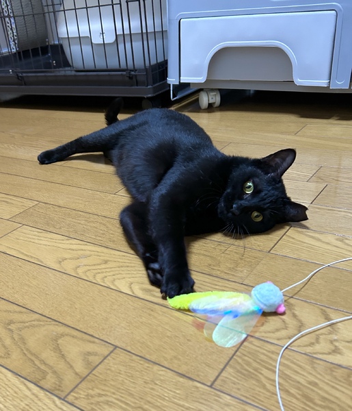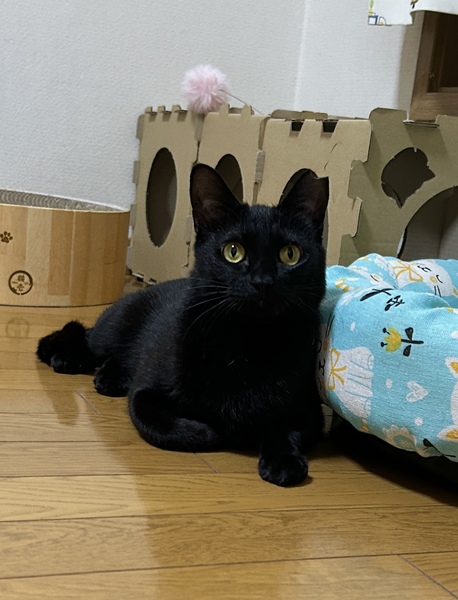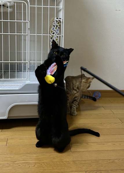 | 特徴(性格など) | 人慣れ訓練中ではありますが猫じゃらしなどで体を撫でると目を細めてゴロゴロ喉を鳴らし、最近では可愛い甘えた鳴き声を聞かせてくれる様になりました。性格はおとなしめでつい先日まで一緒のお部屋で過ごしていたむぎくんとも仲良しになり一緒に遊んでいました。おもちゃも大好きで保護主と猫じゃらしで遊ぶ事が日課になっています。長いゴム紐のついた猫じゃらしが特に好きでそれをキャッチするのが楽しいようでよく遊びます。毛がつやつや、ふわふわで毛並みがとても綺麗な甘えたさんになりそうな可愛い猫さんです。 | ||