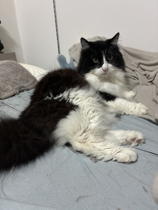 | 特徴(性格など) | 性格は甘えん坊さんでスリスリが好きです。 傍に寄ってきて可愛いです。 色は、黒白です。 |
