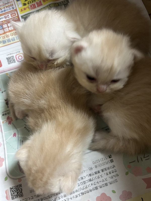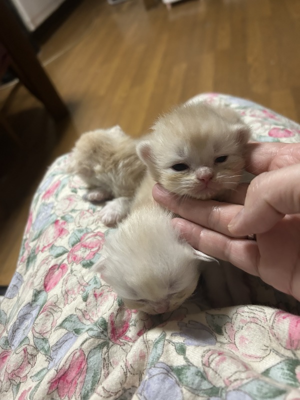 | 特徴(性格など) | 両親ラガマフィンの赤ちゃんニャンコが3匹生まれました! パパはクリーム色、ママ猫は白で、赤ちゃんニャンコも同じ色をしています。 |