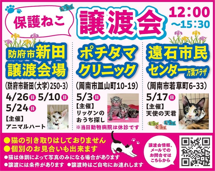 | その他(譲渡条件など) | ペットの飼える住居で完全室内飼育でお願いします。 ご家族の同意がある方。 最後まで可愛がってくださる方。 猫アレルギーのない方。 単身者、高齢者の方は後見人のおられる方に。 |