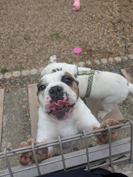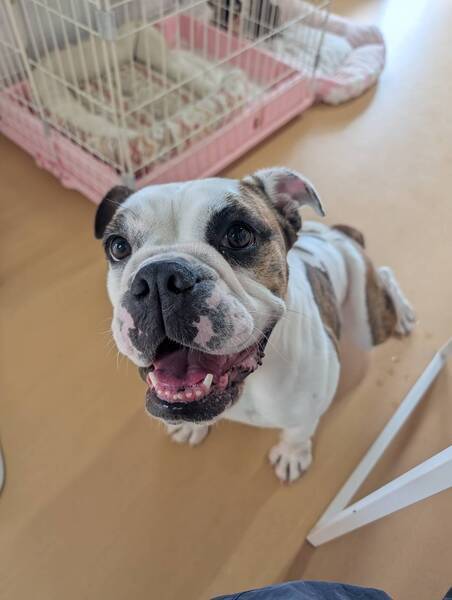 | 特徴(性格など) | 【仮名】エル 【性別】女の子 【犬種】ブルドッグ 【生年月日】2023.8.5 【体重】18.5kg 【トイレ】80%シートでしています 【お散歩】練習中 【留守番】ケージとスーパーワイドシーツ2枚分のスペースでお留守番しています 【トリミング】月に1度くらいのシャンプー 【健康状態】初期検査異常無し 【お薬】無し 【詳細】とても怖がりです。 保護して1週間ぐらいはケージから出てきませんでした。慣れると尻尾よりお尻ごとフリフリして甘えん坊になってくれます。大きな音や見慣れない物が怖いようです。 初めての人も苦手で吠えたり逃げたりしますが、食いしん坊なので初めての人からでもへっぴり腰でオヤツは食べます。他のワンコとも今の所は大丈夫です。カミカミできるおもちゃが好きです。 ハーネスに慣れていないので固まります。 気長にゆっくり慣らして下さる方、空調管理がしっかりできるおうちを探しています。 |