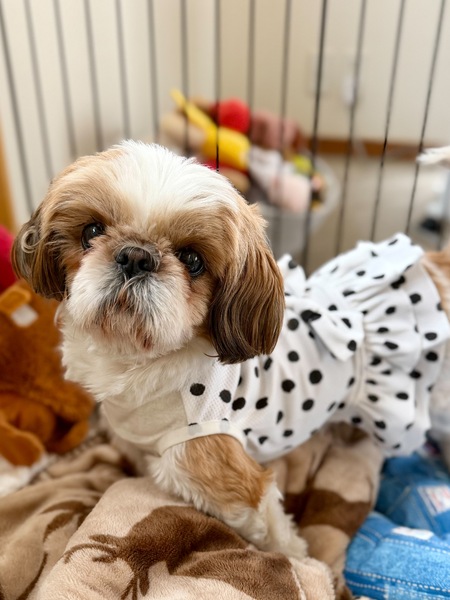 | 特徴(性格など) | 名前(仮名) よもぎ 犬種 シーズー 性別 メス 年齢 推定3歳 体重 4.60kg 健康 5種混合ワクチン接種済 避妊手術済 血液検査済(異常なし) 歯科処置済 臍ヘルニア整復済 心雑音無し フィラリア陰性 耳が汚れやすいので、こまめな耳掃除をお願いします 性格 おっとりしてるようでワンプロもしちゃう元気な女の子です。 空気は読めます。 人もワンちゃん猫ちゃんもフレンドリーに接することができます。 攻撃性は全くありません。 食事 カリカリだけでもよく食べます。 お手入れ マッサージ・ブラッシング・シャンプー・トリミング全ておとなしくできます。 トイレ クルクル回りだすのでシートに誘導してあげるときちんと出来ます。 誘導無しでもときどき成功しますがまだ練習中です。 お外でも出来ます。 お散歩 上手に出来ます。 家でトイレ出来るので雨の日は行きません。 乗り物 車に大人しく乗れます。 ペットカートも乗りこなします。 吠え 遊びたい時に吠えますがしつこくありません。 インターフォンや人が来ても吠えません。 留守番 出来ます。 |