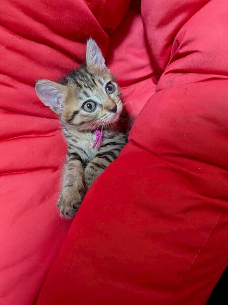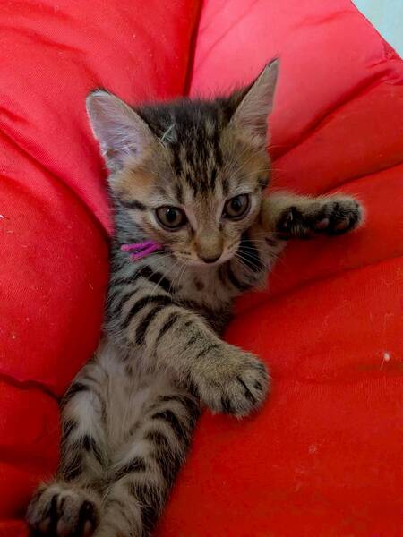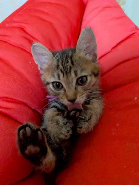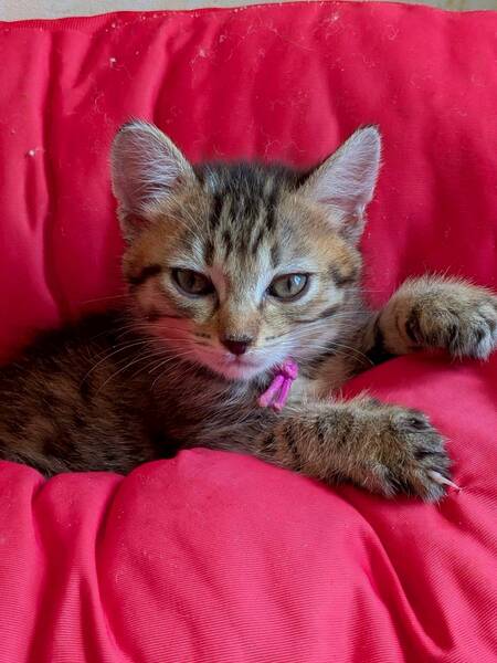 | 特徴(性格など) | ・アピールポイント:キジトラ5兄妹の紅一点。兄妹の中で少し色が明るめ。尾長 元気いっぱいに走り回り食欲旺盛。 ・譲渡先の希望:兄妹と一緒に2匹で迎えてくれる方。又は留守番時間短い方。 ・健康状態:良好です。 エイズ 陰性 白血病 陰性 |