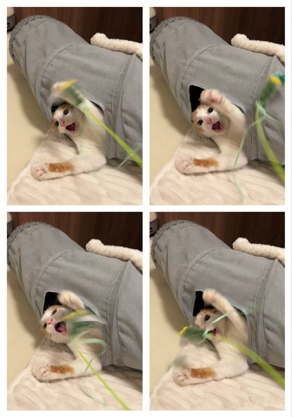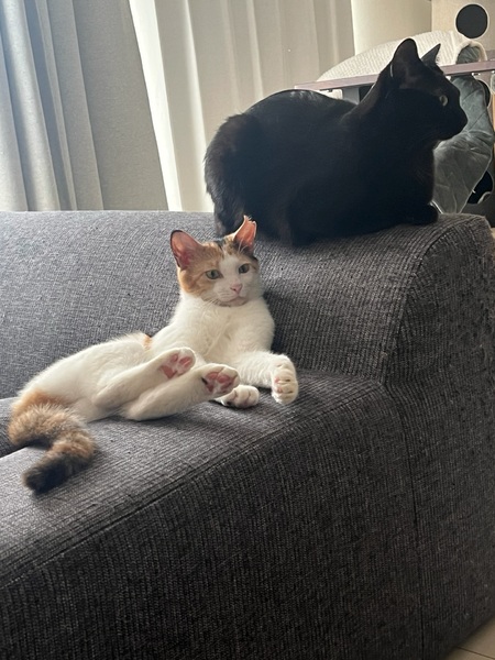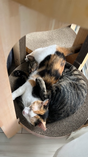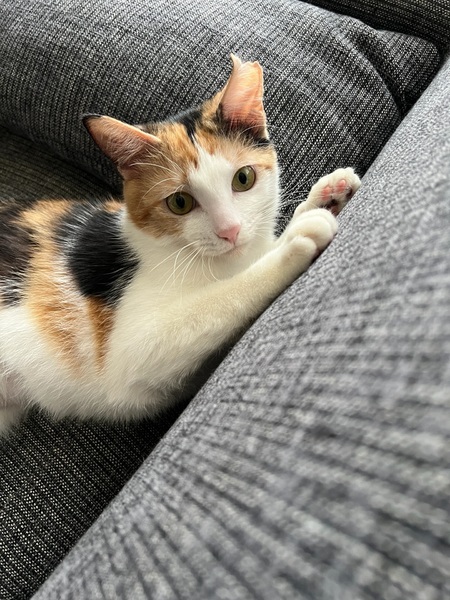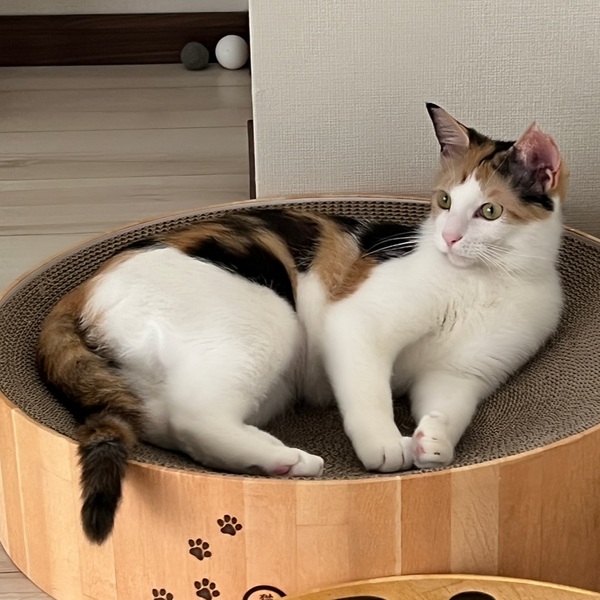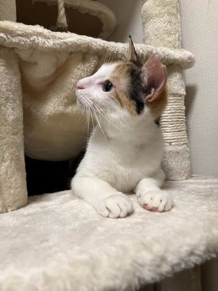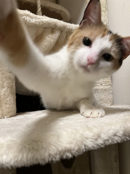 | 特徴(性格など) | はちわれ三毛猫で、しっぽだけパステル縞柄、小顔で手足もしっぽも長い女の子です。 元気いっぱいで、にゃんプロや追いかけっこをするのも、人間におもちゃで遊んでもらうのも大好き! 元気が有り余っている若いねこさんの遊び相手を探しているおうちに行けたら、相性抜群だと思います。 食べるのも大好きで、好き嫌いなくよく食べますが、たくさん運動するのでスリムです。 保護されて2ヶ月ほどの間、人間に対してシャーしたことはなく、猫パンチで爪を出したこともありません。 リラックスしているときなら全身なでさせてくれます。 ごはんもおやつも人間の手から食べられるどころか、食べさせてもらうのを待っていることもあります。ゴロゴロとのどを鳴らしながら食べる姿も可愛いです。 遊んで欲しいときは、人間にタッチしておねだりします。 毛布越しですが、夜は人間に寄り添って眠ります。これからもっともっと甘えん坊さんになりそうです。 |