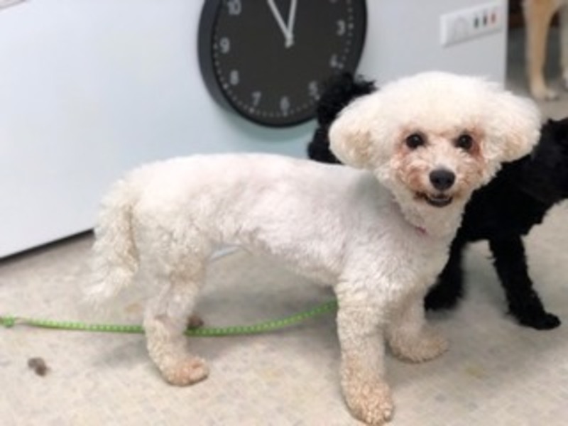 | 特徴(性格など) | あだ名はもちちゃんです。 ビションフリーゼの女の子。体重約5.8キロ。 逆さまつげで涙が多め。声帯を切る手術をされているようです。子供、犬とま仲良しのマイペースな子になりました。 トイレトレーニングなどもできています。 |