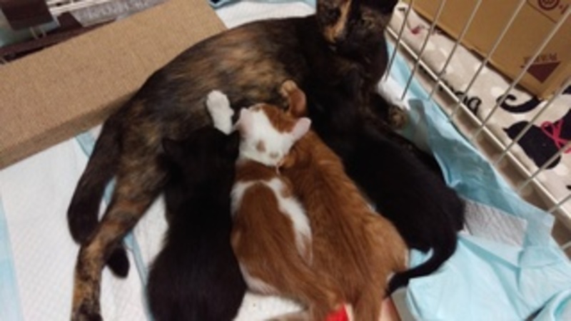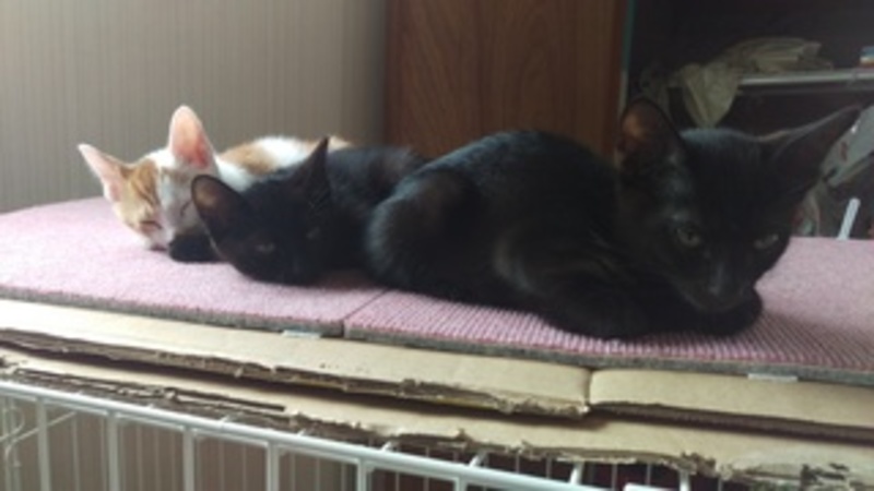 | 里親募集する理由 | 募集の経緯 TNR目的で保護した妊娠猫が6月2日に5匹の子猫(1匹は生後2日で死亡)を出産しました。 母猫(室内で子育て中)は子猫が離乳したら避妊手術をします。 子猫の譲渡は9月上旬です(今は母親や兄弟と今は過ごさせています) ・4匹いてとても賑やかですが、実際1匹1匹がみんなとってもやんちゃな子達です。それだけ元気で健康な証拠ですが、里親を希望される方は、ご自身のお住まいでご家族、ご近所にご迷惑が掛からないか、十分ご検討ください。必要に応じて、床の防音対策をしなければいけないこともあるかと思いますが、それでもなお苦情などは来ないでしょうか。 ケージを使い、遊ぶ時は遊ぶ、休む時は休むというオンオフを親である里親様がしてコントロールする状況が必要になってくると思われます。外出するとき、寝るときに猫達(特に小さい間)の安全のため、ケージを用意していただくようお願いします。4,50分から1時間半くらい遊んでご飯を食べればこてんと寝てしまいます。起きて多少ケージの中で遊べるように、2段もしくは3段のケージにしていただくと、長く使えると思います。(最近は災害も多いですので、慣らしておくと安心です。) 【2匹でのお迎えをご検討ください】 先住猫がいる場合、相性がお心配だと思います。この子たちは、よほどのことがない限り、気にしないと思いますが、反対にこの子たちの元気をどれくらい受け止めていただけるかが気がかりです。 おとなしい子だと難しいと思います。 兄弟(雌1雄3)、2匹づつでの譲渡を希望しています。相性はみんな仲良しなのですが、茶色2匹は近所のボス猫さんの子らしく、運動神経が非常にいいので、黒茶の組み合わせのほうがいいかもしれません。 健康状態 母猫から十分なミルクをもらって育ちました。 今は離乳食とカリカリをモリモリ食べています。 体重:1000g前後 ウイルス検査:未(母猫7/14実施 FIV/FeLV陰性) 検便:母猫の便を検査し、クリア ワクチン:末接種 特徴:夏に譲渡できるようにと兄弟で『夏』をテーマにした仮名を付けています。 普段は「えだ」ちゃんと呼んでいます。全身つやつや~の黒い毛です。お腹・太もも・うなじ?あたりに縞模様がうっすらあります(一年前に同じ母親から生まれた「あんず」がスモークのかかったような黒トラです。参考に、「あんず」の写真も載せておきますが、ここまでのトラ模様にはならないようです。) そして、「幸せの『かぎしっぽ』」です。長めの尻尾の先っぽ4分の1くらいが少しだけ曲がっています。 好奇心旺盛で一番先に行動します。カリカリを食べ始めたのもえだちゃんです。そして一番人懐っこいです。膝の上でグーグー寝てしまいます。おもちゃで遊んでいても、人にぴたっとひっついてもたれています。肩や背中にも乗ってきてかわいいですよ。 紅一点の「おり」です。男の子ばかりの兄弟で、すっかり「やんちゃ」になってしまいました。どの子ともよく遊び、負けていません。えだと同じく、膝に乗ってきてくれます。最近は女の子らしく、美人さんになってきて、一緒に住んでいる1歳年上の姉猫「あんず」と美しさを張り合っています(美人お姉ちゃんをライバル視しているようなしぐさがかわいいです)。えだとそっくりさんですが、並ぶと女の子っぽいですし、体も小さいです。 「かき」はぼーとしているように見えることもありますが、元気に飛び回ってます。ちょっと不思議な子です。変なところで休んだりしています。えだやきんの真似っこで楽しいことを覚えていってます。 「きん」は一番我が道を行くタイプです。ケージからも必ず一番最初に飛び出します。一番人馴れしてないところもあります。 かきときんの父親猫はその柄からうちの近所のとってもすばしっこい暴れん坊さんだと思われます。この父親譲りの運動神経で大人になると思いますので、脱走対策を入念にお願いします。 みんな元気いっぱいですので、いっぱいいっぱい遊んであげてください。おもちゃも大好きです。若いお兄ちゃんお姉ちゃんがいらっしゃるご家庭にも向いています。元気に走り回る子達ですが、生来、攻撃性はありませんのでご安心ください。母猫も保護して3か月ですが、ゴロゴロスリスリしてくれます。 募集条件 ★募集範囲【京都市内】(滋賀(湖西)、北大阪、京都府下は場合によりますのでお問い合わせください。) ★【9月上旬お渡し】【当方でのお見合い】【お宅確認のための訪問】【お届けでのお引渡し】【譲渡誓約書・避妊去勢手術誓約書(手術を一定期間の間に必ずしていただく旨)へのサイン】【身分証提示】【医療費負担】をご了承ください。 ☆【兄弟・母親と一緒】を優先します(基本兄弟一緒を前提)。 譲渡条件 ◎脱走防止対策の徹底(玄関や窓に具体的な脱走防止を自ら進んでできるかた) ・完全室内飼い(ベランダ・ハーネスを着けての散歩も不可) ・猫の飼える住居にお住いのかた(賃貸のかたは契約書を提示してください)で、引