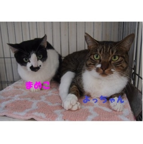 | 特徴(性格など) | キジ白の子がよっちゃん、男の子 白黒の子がまめこちゃん、女の子です。 どちらも2歳くらいで、人によく馴れた、とっても可愛い子です。 大人しくて、落ち着いていて、本当に良い子です。 健康状態良好 ワクチン接種済み ウイルスチェック(エイズ・白血病)マイナスでした。 不妊去勢手術は2匹とも済んでいます。 |