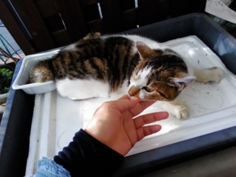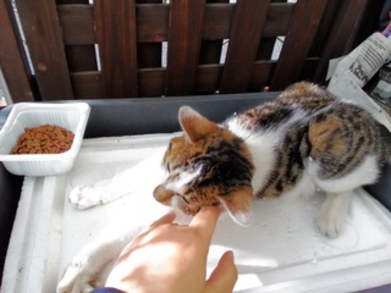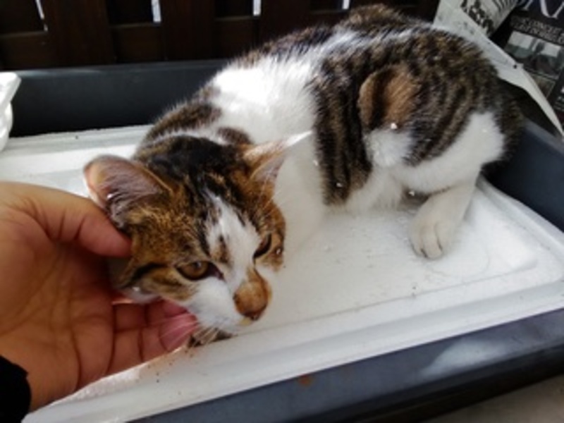 | 特徴(性格など) | 白が多めのシマ三毛猫、目の色はゴールドです。しっぽは短いかぎ尻尾です。顔を見せるとなでて〜とすり寄ってくる、とても人懐こい甘えん坊で、保護した翌日からだっこされる、膝に乗ってきて眠る、など性格は大らかでオープンです。 性別は猫博士の知人に見てもらったところ、オスだろうとの事です。 |