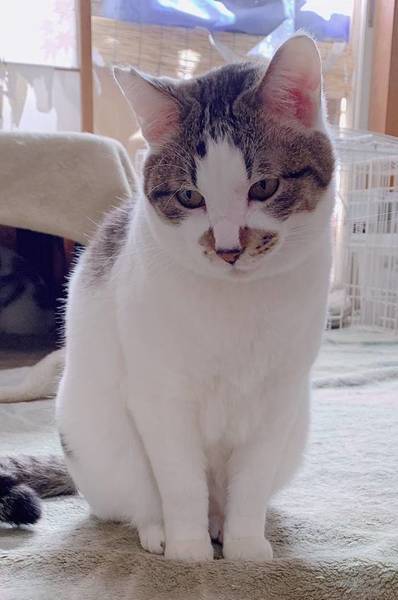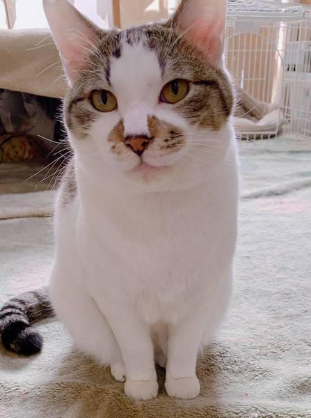 | 特徴(性格など) | ずばり、構ってちゃんです。他の子を撫でていると、割り込んできて、オレを撫でろと要求してきます。一時は、たくさんの猫と暮らしていたストレスからか、粗相をしていた時もありますが、猫が少なくなった事もあり落ち着いてきました。顔も体も大きいけれど、小心の甘えん坊ですので、この子だけを可愛がってくださるご家族を希望しています。 | ||