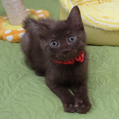 | 特徴(性格など) | 5月5日(日)ミャオ!ねこのおうち譲渡会に参加しますので、そちらに会いにいらしてください。 ◇仮名◇くりたんちゃん ◇毛色◇焦げ茶 ◇性別◇メス ◇性格◇ ワンちゃんでは見かけますが、ネコでは珍しい、綺麗な焦げ茶の単色の女の子です。 何かのミックスでその色が出たのかと思います。 顔というか目というか、ちょっと表情が一風変わっていて、今の毛色も成長と共にどんな風に変化していくか判りませんが、元気いっぱいでとても可愛い子です。 まだ小さいので性格は判りませんが、小さい時から人の手に触れているので、慣れ慣れの可愛いゴロゴロおチビさんです。 |