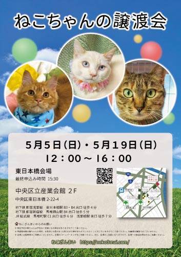 | その他(譲渡条件など) | ★仔猫ご希望の里親様★ 仔猫ちゃんたちは、まだ体がしっかりしていない赤ちゃんです。 下痢だけでも数時間対応ができなかっただけ死に至る事もあります。 その為、月齢に応じたお留守番時間を設けさせていただいております。 また、子猫ちゃん(6ヶ月未満)の里親様には子猫支援金のご協力をお願いいたしております。 ★猫ちゃんとのお見合いは譲渡会で!★ ねこざんまいの猫ちゃんは譲渡会でのお見合いのみとなります。 『この子はいつ譲渡会に参加するの?』『譲渡会場の場所はどこ?』など はねこざんまいホームページをご覧ください。 https://neko3mai.com/ ★楽しく猫ちゃんと触れ合って♪★ ねこざんまい譲渡会は、猫ちゃんも里親様も保護主も笑顔で過ごせる譲渡会を目指しています。 これから20年以上、楽しい時も、悲しい時もいつも傍にいてくれる大切な家族になる猫ちゃんです。 会場には沢山の猫ちゃんがいます。 1匹1匹、触れ合って猫ちゃんとお話ししてください。 『初めて猫ちゃんを家族に迎える方』 『先住猫ちゃんのお友達を迎える方』など トライアルの仕方や先住猫ちゃんと仲良くなるコツなど経験豊富な保護主やスタッフにお気軽にご相談ください! 猫を愛し、そして猫に愛されている猫好きスタッフと保護主がアドバイスさせていただきます。 ★里親希望のみなさまへ★ ペットではなく、家族一員としてたっぷり愛情を注いでくださるご家庭をお待ちしております。 恐れ入りますが、 ・学生の方 ・一人暮らし、同棲中の方 ・子猫、若猫希望の60歳以上のみのご家庭 ・脱走防止対策にご協力いただけない方 は原則お断りさせていただいております。 ただし、預かりボランティアさんとして新しい家族が決まるまでの間、猫ちゃんを預かっていただく道もございます。 参加猫ちゃんは、それぞれ保護主(実際に猫ちゃんを自宅に入れ、保護をしている方)が異なります。 詳しい条件なども異なる場合がございますので、会場内で直接保護主とお話ください。 〖共通条件〗 1.終生飼育 2.完全室内飼い 3.脱走防止対策へのご協力 4.避妊去勢手術 5.契約書類へのサイン 6.定期報告 7.医療費等の負担 当日の猫ちゃんを連れて帰ることはできません。後日、保護主が里親様のご自宅までお届け致します。 その為、移動の際の猫ちゃんの負担を月齢などから考慮し、お届け地区を限定させて頂くこともございますのでご了承ください。 |