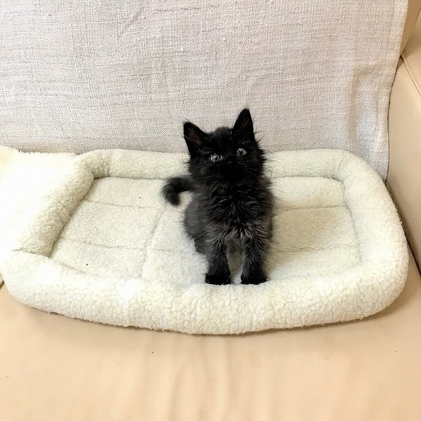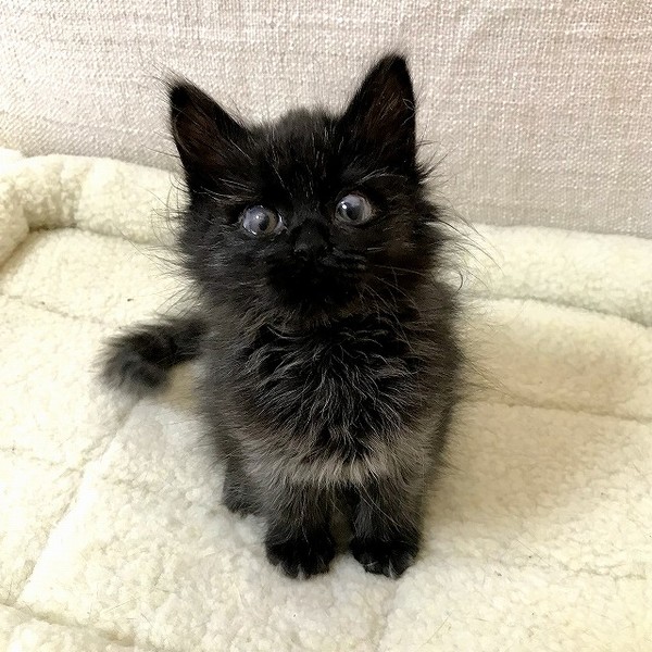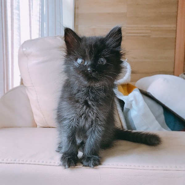 | 特徴(性格など) | ☆仮名 メアリー ☆性別 メス ☆年齢 推定3ヶ月(2019年3月中旬頃生まれ) ☆体重 1キロ(2019年6月5日現在) ☆毛色 黒長毛。ブラックスモーク? ☆猫風邪治療済み ☆寄生虫駆虫(レボリューション2回) ☆トイレ躾済み ☆3ワクチン2回済み ☆エイズ白血病(陰性) ☆猫風邪の後遺症で目に白濁が残っています。 保護時(推定1ヶ月)はたったの180グラムしかなかった小さな小さなメアリー。 風邪の治療を頑張って1キロを超え、活発な女の子に成長しました。 平均より小さめの体ですが、ごはんをモリモリ食べて元気いっぱいです。 ごはんはドライフードを1日3回に分けて与えています。 やわらかいふわふわな長毛。 毛色は、黒一色でなくグレーまじりで「ブラックスモーク」のよう。とってもオシャレです。 猫風邪で角膜潰瘍(角膜の傷)を起こし、目薬を毎日頻回点眼して治療しました。 その甲斐あって良くなってきましたが、黒目の一部白濁は完全には消えないかもしれません。 視力に問題はなさそうです。 キョウダイたちと追いかけっこをしたり、階段の上り下りも健常な子と同じようにしています。 オモチャでもよく遊びます。 ★まだ子猫です。たくさんかまって愛情を注いでほしいため、お留守番がないか、短いおうちを希望します。 ★キョウダイ「ブライアン」「ロジャー」も募集中です。 仲良しなキョウダイ同士でのお迎えをご検討いただけると嬉しいです。 ★若い遊び好きな先住猫さんともうまくいくと思います。 ★保護猫たちの様子は動画をご覧ください♪ https://www.youtube.com/user/komugi710 このページの「動画」をクリックしてください。 保護からの成長記録がたくさんあります。 |