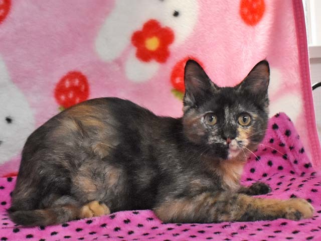 | 特徴(性格など) | 元気いっぱい天真爛漫な桜咲(さき)ちゃんです。 兄妹の青葉くんと一緒に遊んで、走り回って、じゃれて、寝たりととっても仲良しです。 知る人ぞ知るサビ柄の魅力たっぷり。 しっぽは長めで、先だけ少し曲がった鍵しっぽが幸せをひっかけて来てくれます。 色々なものに興味があるようで、猫じゃらしにも立派に飛びつきごはんもモリモリ食べてくれます。 子猫らしい仕草が見ていて飽きません。 ちょっと目を合わせただけでゴロゴロいう甘えん坊さんでもあります。 人の手で育てられましたので、人間大好きな子に育ちました。 食事はふやかしたドライフードと缶詰を1日4回です。 トイレも失敗無く出来ています。元気いっぱいなので、高齢の猫ちゃんのいないお宅の方が安心です。 子猫は体調が急変したりと何が起こるかわかりません、お留守番の少ない、小さなお子様のいないご家庭を希望します。 終生完全室内飼育と、定期的なワクチン接種、避妊去勢などの健康管理をお願いします。 |