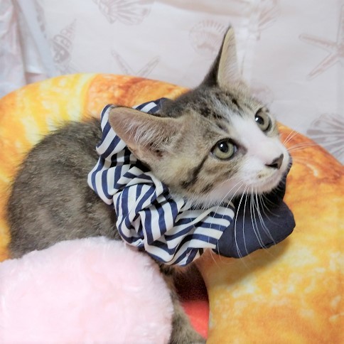 | 特徴(性格など) | キジ白、尻尾は半分くらいの長さのカギ尻尾です。 きょうだいのなかではリーダー的存在。元気印です。 1頭でも譲渡は可能ですが、うにくん、ごえもんくん、くりくんはきょうだいなので、一緒のご縁があればうれしいです。 |