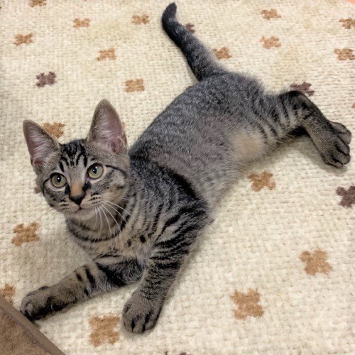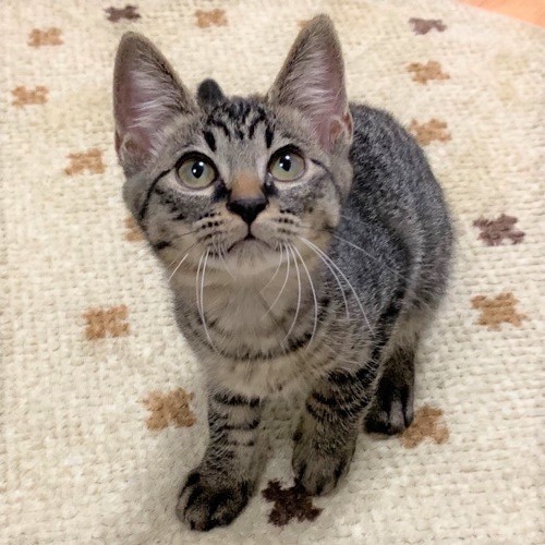 | 特徴(性格など) | 運動能力が高く、とにかくよく遊び、好奇心旺盛!尻尾は長くまっすぐでとても綺麗です。 快食快便、エンジンが切れるとぐっすり。メリハリのある男です!(笑) お腹がすいたり、何か伝えたいことがあると鳴いて知らせてくれます。 最近は体を撫でると、ゴロゴロ音を聞かせてくれることも増えてきました。 兄弟のそうくんや大人の保護猫さんと元気いっぱい走り回ったり、にゃんプロしたりして遊んでいます! 1匹での譲渡もOKですが、兄弟のそうくんと一緒だとより嬉しいです。先住猫さんのいるお宅でもうまくやっていけると思います。 譲渡会では固まってしまい、元気さが伝わらないのが残念です(笑) |