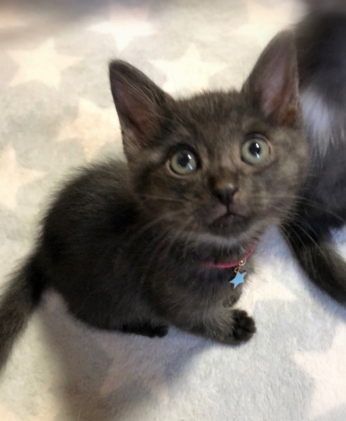 | 特徴(性格など) | 濃いブラックスモーク・手足胸とお腹の毛が長目です。 むちむち幼児体型 食いしん坊で甘えん坊。 今のお気に入りは、アルミホイル。 カサカサ音が楽しいようで、一生懸命追いかけています。 後ろ足を人の体にほんの少しだけくっつけ、ゴロゴロ言いつつ眠ります。 |
