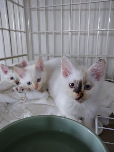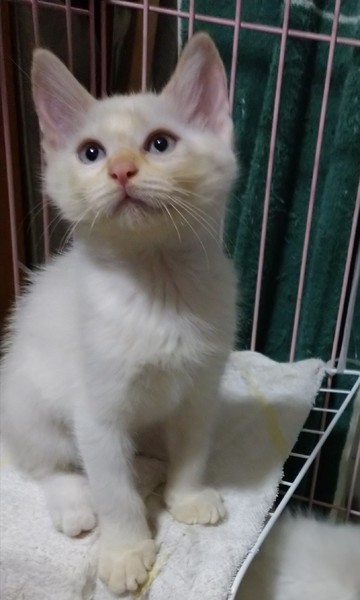 | 特徴(性格など) | 兄妹3匹の中でちょっとビビりのツンデレちゃんです! 美形女子! 綺麗なブルーアイはみんな共通。お耳とお顔、尻尾に模様があります(*^^*) キリッとした顔立ちの美形で可愛らしい子です♡ ちゅーるは手に抱きついてくるほど夢中(笑) オモチャで遊ぶのも、みんなと取っ組み合いも大好きです!! ただ、寂しいと泣いたりしちゃう子達なので、兄弟姉妹二匹か、優しい先住ちゃんがいるご家族様だとお留守番もストレスも安心です(TT) |