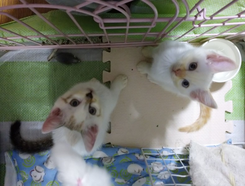 | 里親募集する理由 | 通りすがりに、草むらでママ猫と子猫達を発見して保護しました。 女子2 男子1 います! とっても小柄なママ猫が、ガリガリになって必死に育ててました(;_;) 先住猫もいるので、乳離れもして元気いっぱいの子猫達にはどうしてもケージにいて貰わなきゃなりません。 たくさん愛情を注いでくれる家族を募集します(>_<) |