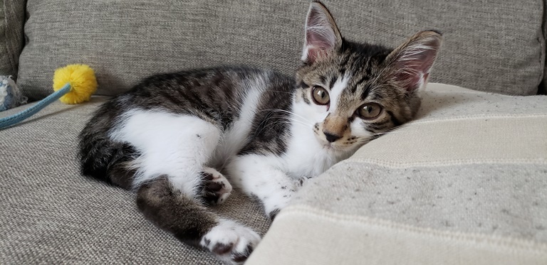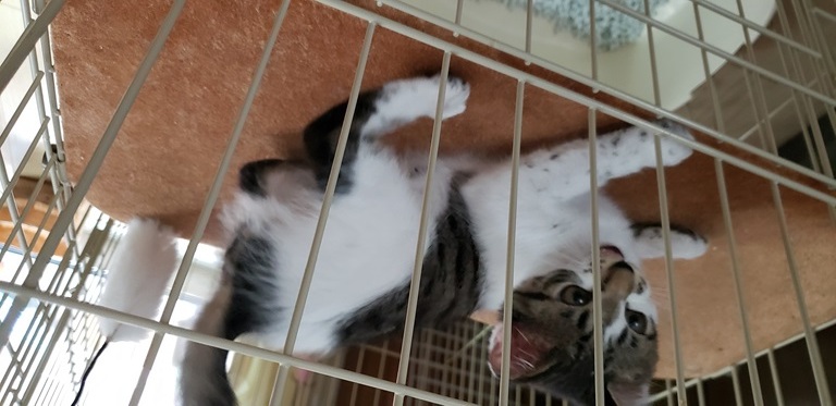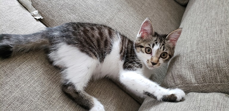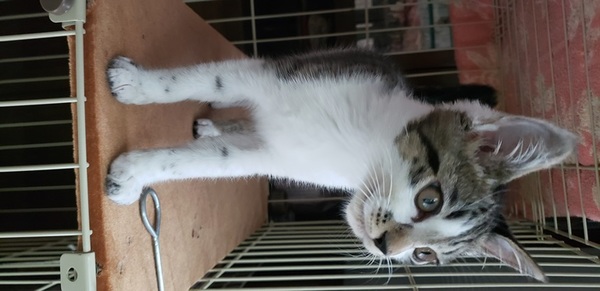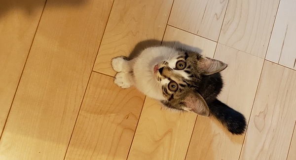 | 特徴(性格など) | キジ白 しっぽは短め 先が幸せのカギしっぽ。 甘えん坊で人の顔を見るとゴロゴロ喉を鳴らします(病院でも) 人と遊ぶのもお膝に乗るのも大好きですが、1人でもよく遊びます。 ゲージでお留守番もいい子で出来ます。 鳴き声は小さく サイレントにゃーが多いです。 大人猫とも上手に挨拶出来ます、少しずつ仲良くなっていく感じです。 |