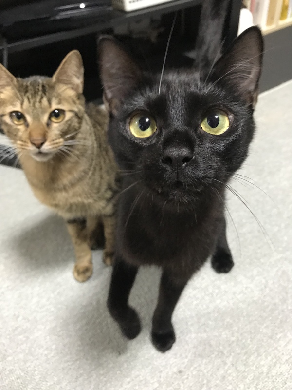 | 特徴(性格など) | 黒猫くん♂ いつも兄弟と一緒に寝ています。 毛づくろいした毛を丸めて毛玉ボールしたボールで遊んだり、猫じゃらしで遊んだり、好奇心旺盛な男の子です。 特徴 骨格が小さく小柄です。 尻尾は長く、毛も長めでサラサラしています。 キジトラ猫くん♂ 温厚で一人で寝たり、兄弟と一緒になかよか寝ています。 黒猫と同じように毛玉ボールで遊んだり、猫じゃらしで遊んだり、好奇心旺盛な男の子です。 絨毯の上でゴロゴロしながらくつろいでいます。 特徴 毛はあまり長くなく、毛並みはふわふわしています。 尻尾は長めです。 高いところが好きで、冷蔵庫かキャットタワーの上でよく寝ています。 |