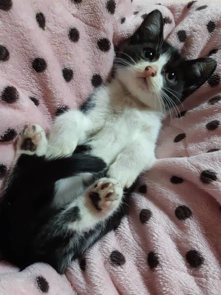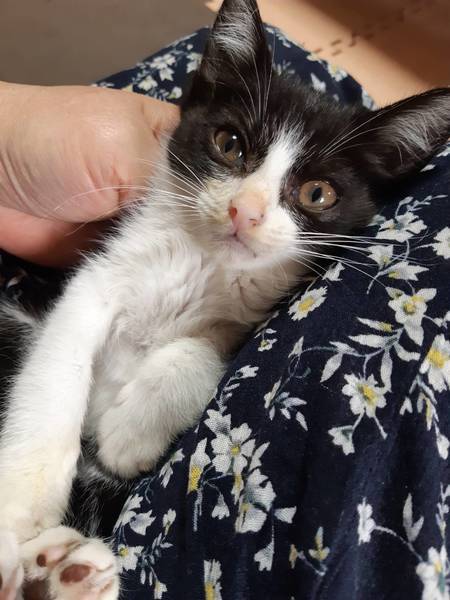 | 特徴(性格など) | 普通に白黒ちゃんですが黒が多めの白黒ちゃんです。穏やかな大人しいオスの子猫ちゃんです。ご飯の時に鳴いて ちようだいしまさがそれ以外は殆どなきません。人慣れはしてます。トイレも完璧です。食いしん坊ちゃんです。痩せ型で体重が800グラムです。 | ||
