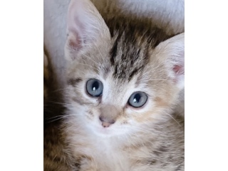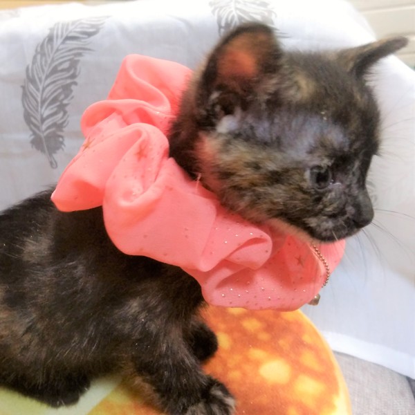 | 特徴(性格など) | サビ柄、まっすぐな長しっぽです。 きょうだいの中でもおっとり…×100くらいの子猫です。 みんながごはんではしゃいでいても気づかず、最後にやってくる超ぼんやりさんです。 |
