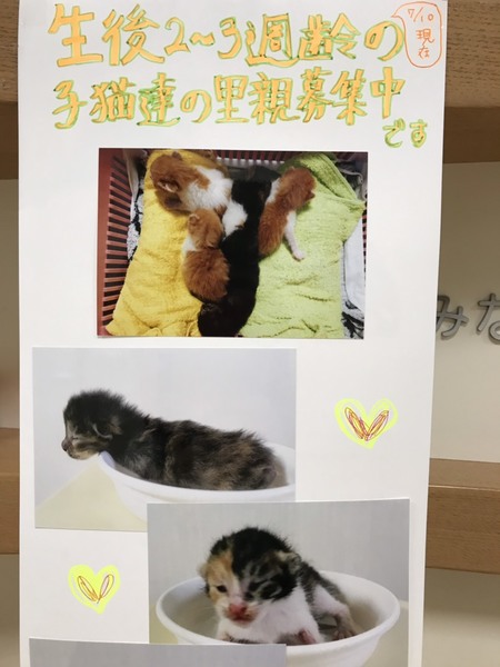 | 性別 | 猫 ♂・♀ | 年齢 | 推定生後1カ月位 (2019/07/23 掲載時 ) |