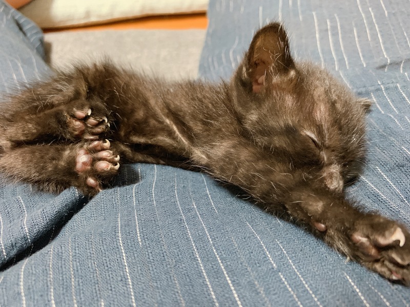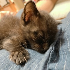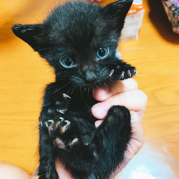 | 特徴(性格など) | まだ生後3週間目くらいの真っ黒な猫ちゃんです。 性格は甘えん坊で、人懐っこく時々爪をしまい忘れたりしますが基本的には姿を見ると走りながら追いかけてあとを追ってきたりします。 数日前に我が家に来たばかりでワクチンなどはまだしておらず、駆虫や蚤取りもまだしておりません。 感染症に関しては現段階では罹患していないとの獣医師さんのお話でした。 追いつくと足の上に登ってきたり、座っているところに乗ってきてフミフミしたり寝たりなど基本的にかなりべったりな男の子です。 |
