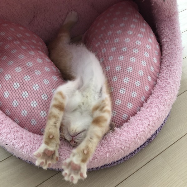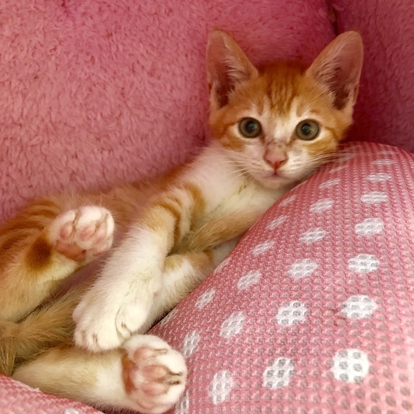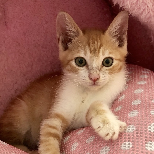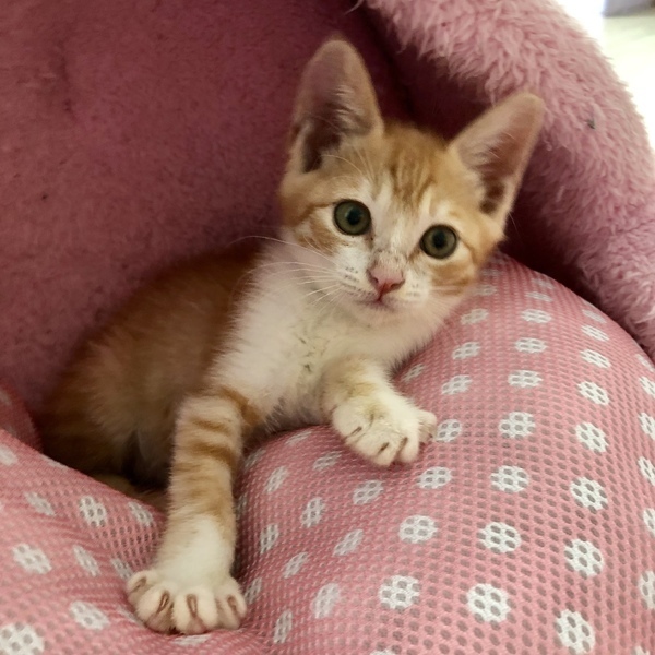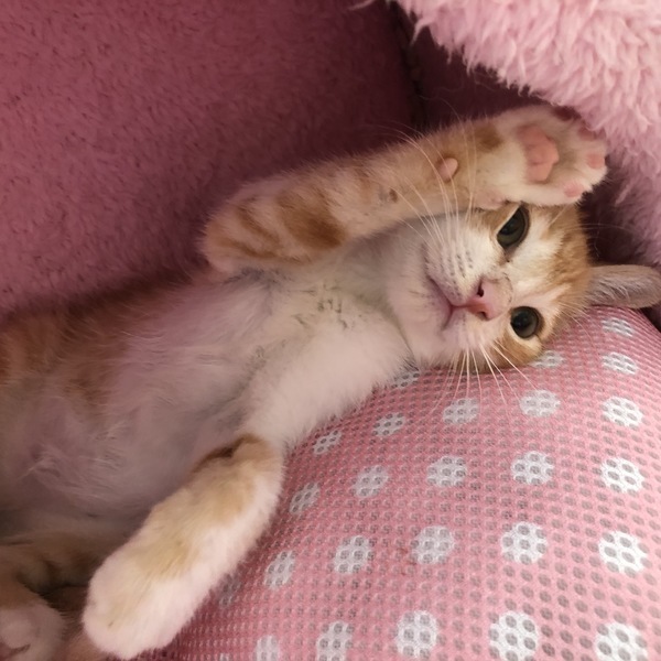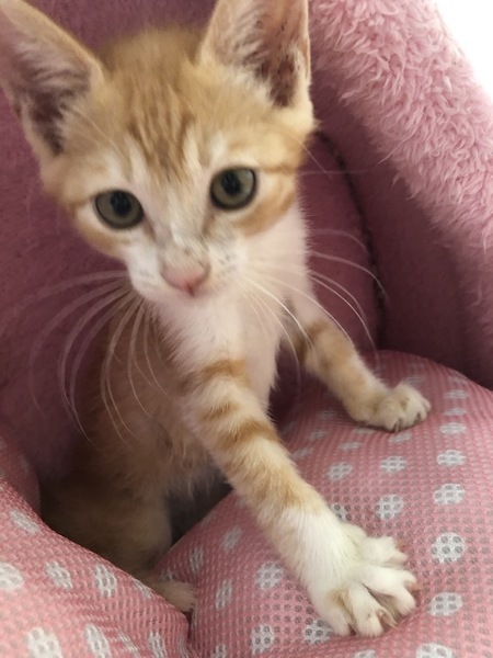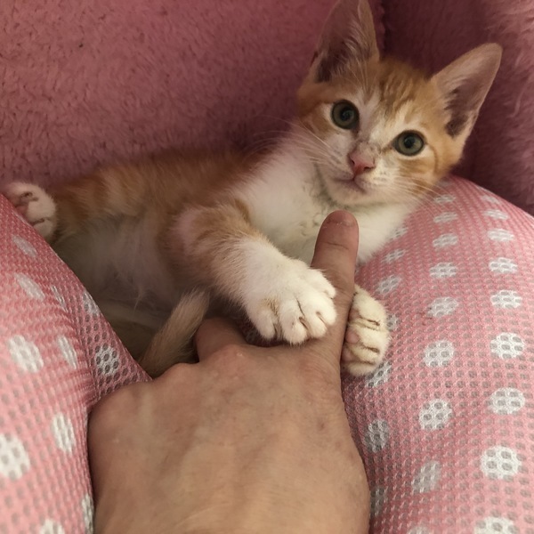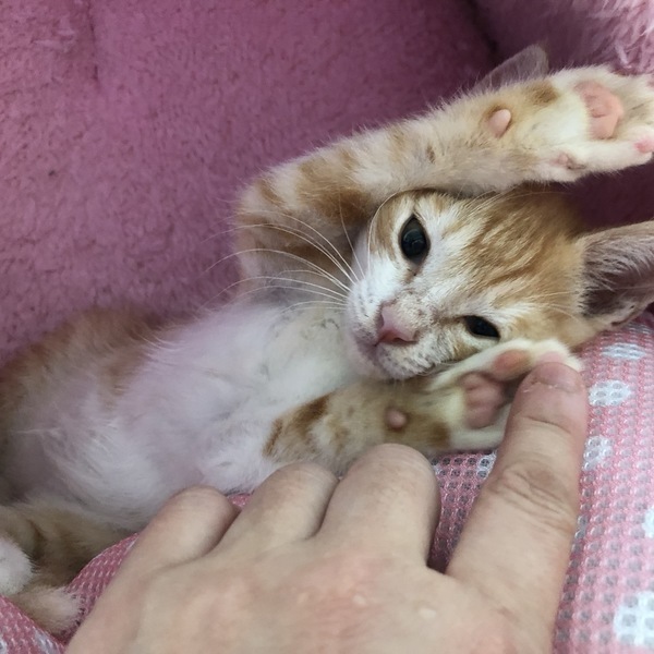 | 特徴(性格など) | 茶白のイケメンですが、女の子のように甘えた声で鳴いてご飯をねだります。ミルクで人が育てたのでとても甘えん坊に育ちました。同じ時期に保護した子猫達と一緒に遊び、大人猫にも物怖じせずに接します。たまにいるのですが、ご飯を食べるのが下手くそでウェットフードをずっとチューチュー吸い続けて顔面からご飯にダイブしていたので、顔がやたらカピカピで掲載用の写真を撮るのに躊躇するほどでした。その割に食べれてなくていつもお腹をすかせ、他の子に餌を取られないようにお皿に覆いかぶさって食べる、そんな愛すべきおバカキャラです。自然に人の膝の上に乗り、甘える子です。とても寂しがり屋なので、いつも他の猫と一緒に同じ格好して寝たりしています。若い猫の先輩がいるお家か、私どもの他の子猫と2匹で迎えてくださるとユビコも幸せだと思います。 特に少し先輩の半長毛のミミシロとはとても馬が合うようで、いつもじゃれ合っています。 健康状態とても健康で元気です ただ離乳時にご飯を食べるのが下手で月齢の割には小さく、今は850gくらいです。 ウイルス検査(エイズ・白血病)陰性 ワクチン(1回) 駆虫 検便 シャンプー |