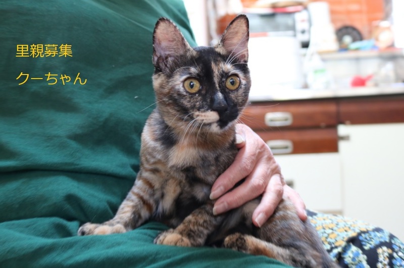 | 特徴(性格など) | さび子猫、女の子、仮名:クーちゃん 推定生後4か月くらい、体重:2.2㎏(9/19現在) 健康診断済み、駆虫済み、 血液検査-エイズ・白血病-陰性(7/20) 三種混合ワクチン接種済み(7/20、8/13) トイレしつけ済み 最初は少し警戒心がありますが、 ゴロゴロスリスリの超甘えっ子です。 |