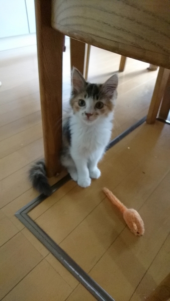 | 特徴(性格など) | 2ヶ月の茶トラ(男の子) おっとりとした甘えん坊です。 長尻尾です。 2ヶ月のキジトラ(女の子) 甘えん坊で活発な子です。短い鍵尻尾です。茶トラ君が大好きです。 5ヶ月の三毛猫(女の子) 人の顔を見ればスリスリゴロゴロの可愛い子です。 ふわふわの長尻尾です。 |