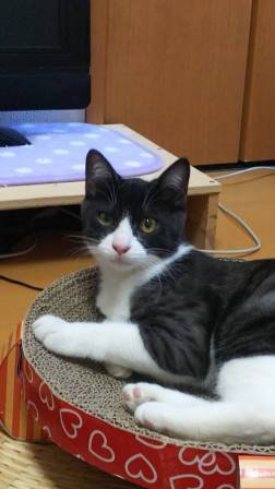 | 特徴(性格など) | 名前:トッポ 黒ではなくダークグレーのきれいなハチワレの男の子 人が大好きで、そばに行くだけでゴロゴロとのどを鳴らします。 兄弟猫ベルと仲良しです |