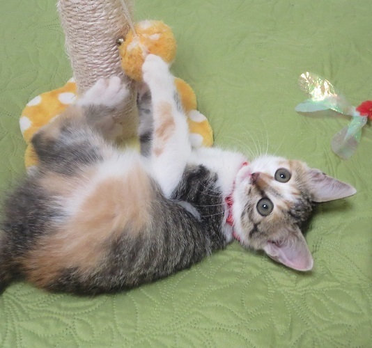 | 特徴(性格など) | 普通なら見つからないところで遭遇できた、とても運の強いチビちゃんです。まん丸体型でおしりが大きく、全体がコロンとしていますが、美人です! コロコロ、ゴロゴロ、元気いっぱい。ホントに可愛いわんぱく三毛ちゃんです。 |