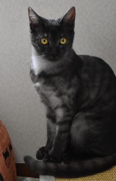 | 特徴(性格など) | ブラックスモークのきれいな毛色です。首周りの模様がゴージャスなファーのようです。 しっぽは長くてまっすぐです。子猫らしく遊ぶのが大好きで人も猫も大好きです。 保護した4匹の猫たち(ウラン、りん、すず) ととっても仲良しですので、2頭一緒か先住猫さんのいるお家を希望しています。 |