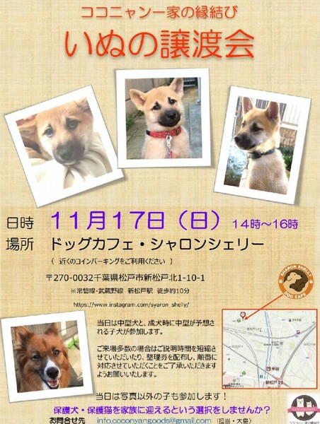 | 特徴(性格など) | ユウヒちゃん、11キロ 人懐こくてかわいい子です。室内トイレでもお散歩中でも排泄可能です。 留守番も可能です。 少々の可愛いいたずらあり。 他の犬とのトラブルはありません。 お客様(特に男性)に対してしつこく吠える事があります。 ご家族の中に男性がいらしてももちろん大丈夫ですが、女性だけの家庭でしたら、ユウヒには、よりピッタリだと思います。 譲渡会に参加予定あり https://ameblo.jp/coconyanikkanoenmusubi/entry-12544545107.html こちらの記事に譲渡会に参加する子たちのお写真が掲載してあります ワクチン済 検便陰性 ノミダニ駆除済 フィラリア陰性 避妊済 マイクロチップ装着済 交通事故で骨盤骨折をしましたが当方で手術し治療は済んでいます。 普通の犬と変わらぬ生活が可能です。 健康状態良好です 11月17日(日)午後2~4時まで、 千葉県松戸市新松戸北1丁目10-1 ドッグカフェ(シャロンシェリー)で犬の譲渡会があり、参加予定です。 こちらの譲渡会場でのお見合いを希望しています。 ぜひお越し下さいませ。 |