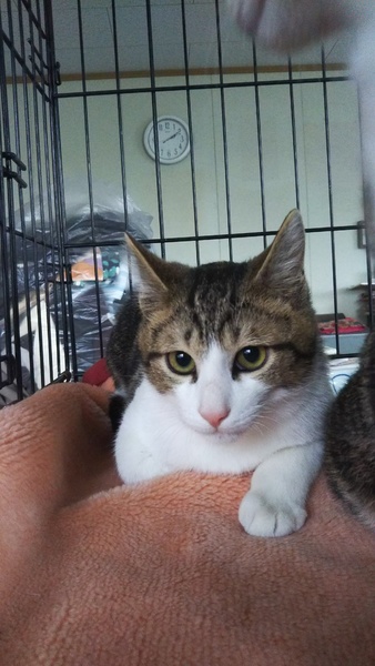 | 特徴(性格など) | アメショーっぽいキジ柄に白の毛。 野良猫が産んで山の中で育ったので、まだ少し人を怖がりますが、触ったり抱っこは出来ます。 とても大人しく穏やかな子です。 |
