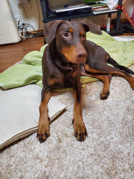 | 特徴(性格など) | 名前はモカです。体重22㎏。 小さめのドーベルマンです。 猫とは全く合いません。 人間が大好きで、とにかく甘えたくてベッタリです。 家の中ではとても大人しく、イタズラもしません。 人の食事中も大人しくして、欲しがる事は一切しません。 家の中で吠えない訓練も1日で覚えました。 とても素直で賢い子です。 以前の環境のせいか、今は仔犬の時期をやり直している感じです。 見るもの全てに興味を示しています。 散歩の時、他の犬を見ると興奮して吠えたり、追いかけようとします。 一般的な服従訓練は入っていますが、現在訓練士の先生に見ていただきながら勉強中です。 ドーベル特有の繊細さも持ち合わせていますので、ドーベルを飼ったことのある方、訓練をされた事がある方、 この子と共に訓練の勉強をしてくださる方に里親さんになっていただきたいと思います。 |