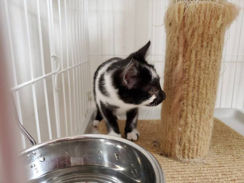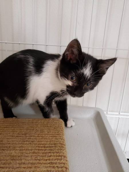 | 特徴(性格など) | 2019.9.21生まれ(推定) 毛色:白黒 とってもかわいい模様の黒白の男の子。 つぶらな瞳に短いしっぽです。 遊ぶのが大好きで甘えん坊。 抱っこも大好きな食いしん坊。 ケージ慣れ、人慣れ、猫慣れしています。 |