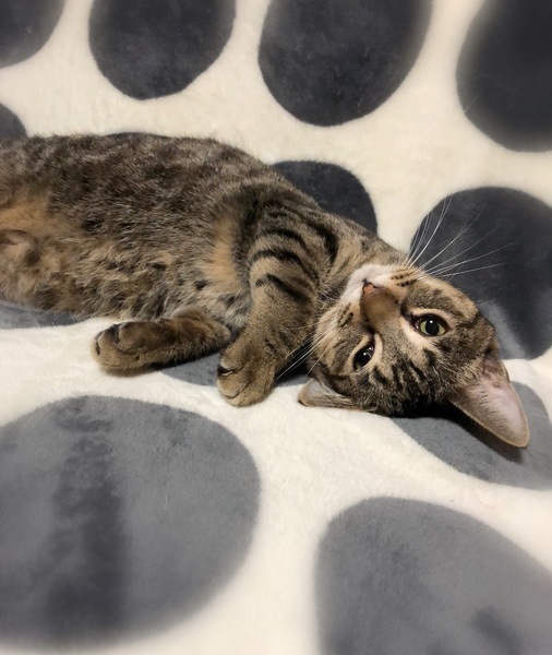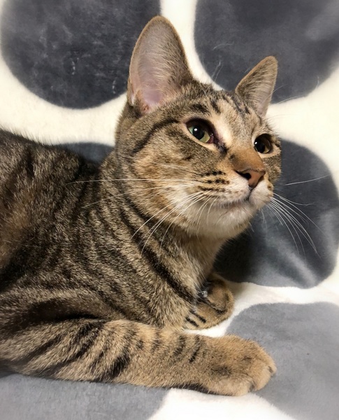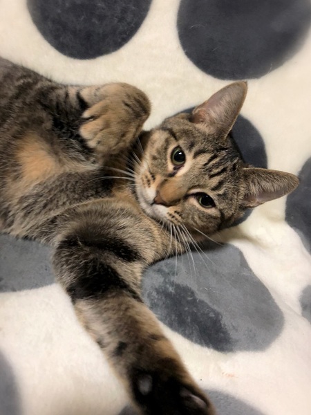 | 特徴(性格など) | 仮名、コラライン 丸い顔・目を閉じるとお地蔵さん・おっとりした性格のキジトラ女の子。 新しい環境にもあまり緊張する様子なく落ち着いています。 抱っこはあまり好きではないですが、撫でられる事が大好き。 眠る時は、人の隣で毛布をふみふみしながら眠ります。 |