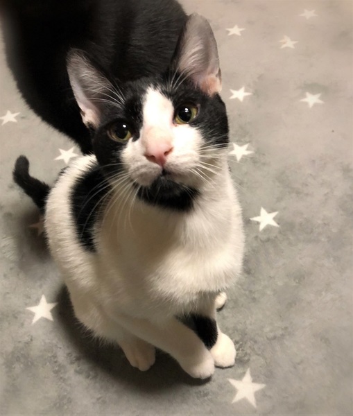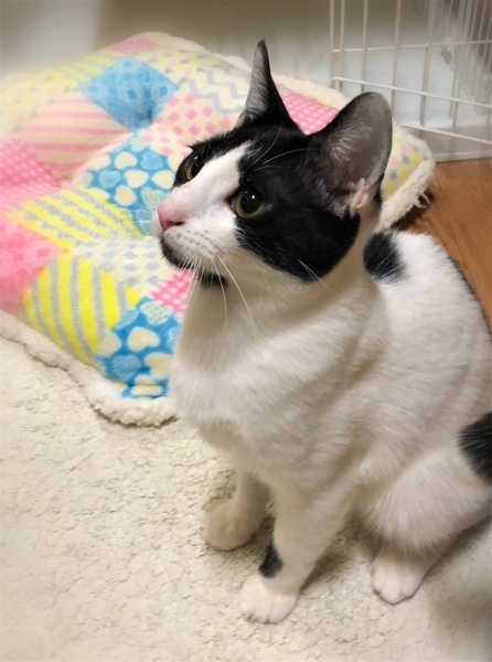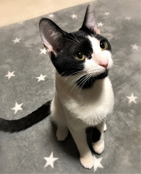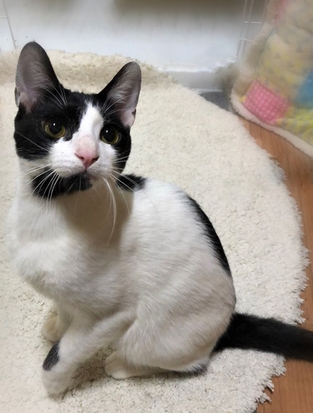 | 特徴(性格など) | 仮名、ポー まるい顔にあごひげ・白黒の男の子。 環境に慣れるまで時間が必要です。慣れてくると何にでも好奇心旺盛。 初めて見るオモチャに興味はあるものの、恐る恐る近づいて来る様子が面白いです。 撫でられると、ゴロゴロ言いつつコテンと横になります。 |