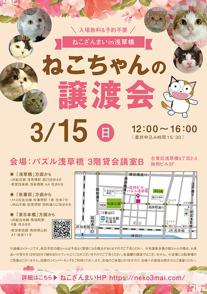 | その他(譲渡条件など) | 3/15譲渡会ご来場に際して ご来場いただく皆様には、マスクの着用をお願い致します。 スタッフもマスク着用の上、対応させていただきますので予めご了承ください。 入口にアルコール消毒薬をご用意させていただきます。 必ず手指の消毒をされてご入場ください。 発熱・咳・全身痛等の症状がある場合は、ご来場をご遠慮下さい。 あきらかに熱がある方や体調のすぐれない方、マスク未着用の方のご入場はお断りさせていただきますので ご理解とご協力のほど宜しくお願い致します。 ~~~~~~~~~~~~~~~~~~~~~~~~~~~~~~~ ★仔猫ご希望の里親様★ 仔猫ちゃんたちは、まだ体がしっかりしていない赤ちゃんです。 下痢だけでも数時間対応ができなかっただけ死に至る事もあります。 その為、月齢に応じたお留守番時間を設けさせていただいております。 また、子猫ちゃん(6ヶ月未満)の里親様には子猫支援金のご協力をお願いいたしております。 ★猫ちゃんとのお見合いは譲渡会で!★ ねこざんまいの猫ちゃんは譲渡会でのお見合いのみとなります。 『この子はいつ譲渡会に参加するの?』『譲渡会場の場所はどこ?』など はねこざんまいホームページをご覧ください。 https://neko3mai.com/ ★楽しく猫ちゃんと触れ合って♪★ ねこざんまい譲渡会は、猫ちゃんも里親様も保護主も笑顔で過ごせる譲渡会を目指しています。 これから20年以上、楽しい時も、悲しい時もいつも傍にいてくれる大切な家族になる猫ちゃんです。 会場には沢山の猫ちゃんがいます。 1匹1匹、触れ合って猫ちゃんとお話ししてください。 『初めて猫ちゃんを家族に迎える方』 『先住猫ちゃんのお友達を迎える方』など トライアルの仕方や先住猫ちゃんと仲良くなるコツなど経験豊富な保護主やスタッフにお気軽にご相談ください! 猫を愛し、そして猫に愛されている猫好きスタッフと保護主がアドバイスさせていただきます。 ★里親希望のみなさまへ★ ペットではなく、家族一員としてたっぷり愛情を注いでくださるご家庭をお待ちしております。 恐れ入りますが、 ・学生の方 ・一人暮らし、同棲中の方 ・子猫、若猫希望の60歳以上のみのご家庭 ・脱走防止対策にご協力いただけない方 は原則お断りさせていただいております。 ただし、預かりボランティアさんとして新しい家族が決まるまでの間、猫ちゃんを預かっていただく道もございます。 参加猫ちゃんは、それぞれ保護主(実際に猫ちゃんを自宅に入れ、保護をしている方)が異なります。 詳しい条件なども異なる場合がございますので、会場内で直接保護主とお話ください。 〖共通条件〗 1.終生飼育 2.完全室内飼い 3.脱走防止対策へのご協力 4.避妊去勢手術 5.契約書類へのサイン 6.定期報告 7.医療費等の負担 当日の猫ちゃんを連れて帰ることはできません。後日、保護主が里親様のご自宅までお届け致します。 その為、移動の際の猫ちゃんの負担を月齢などから考慮し、お届け地区を限定させて頂くこともございますのでご了承ください。 |