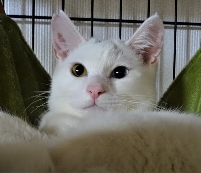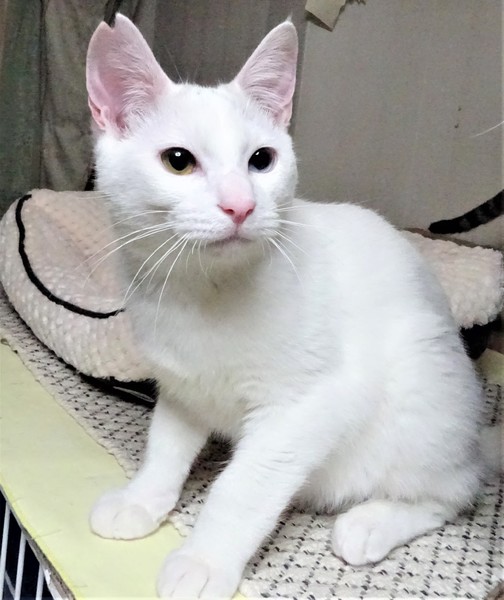 | 特徴(性格など) | 仮名: スノー(オス) 毛色: 白猫、ひたいにうっすらグレー模様、 オッドアイ 性格: 超ビビリです。 ケージに近づくだけで、フ~と威嚇して隅っこに逃げますが、触れます。抱っこも出来ます。 怖くて固まります。 ケージ飼いをお勧めします。 ケージから出るとなかなか捕まえる事が出来ませんが、自分からケージに入ります。 ケージに入っている間に、触ったり抱っこして馴らしてください。 ゆっくりと時間をかけると甘えん坊になると思います。 他猫とはうまく付き合えるようで、特にオス猫と仲良しです。 先住猫がいるお家でも大丈夫ですが、猫初心者の方には難しいかと思いますので、経験のある方にお願いします。 ノミ取り済 検便済 駆虫済 3種混合ワクチン済 去勢手術済 猫エイズ・白血病ウィルス検査はともに陰性 |