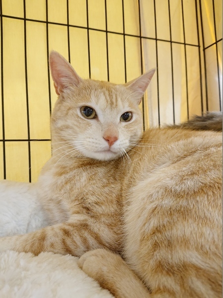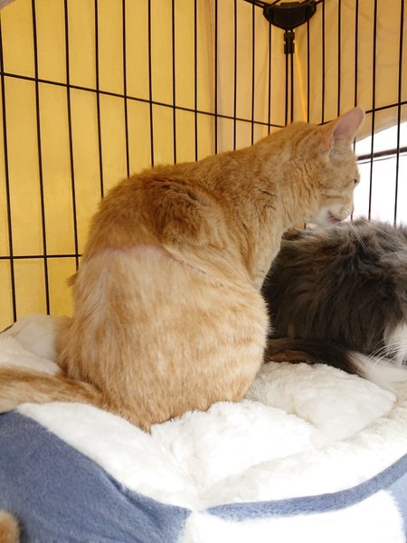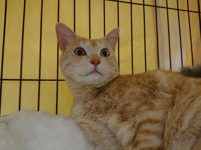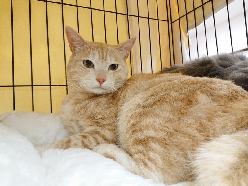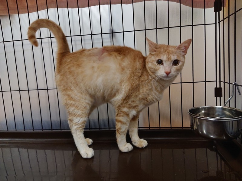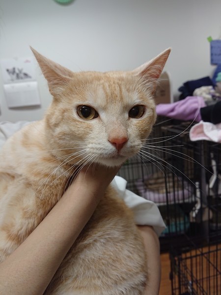 | 特徴(性格など) | 2018.1.21生まれ(推定) 毛色:茶トラ とても人懐こいエイタ。 真ん丸おめめがとってもかわいい男の子です。 頭スリスリ、ゴロゴロの甘えん坊さん。 背中の治療が続きましたが、それでも人間を好きでいてくれる優しい子です。 大人猫とも子猫とも仲良くなれるタイプです。 |