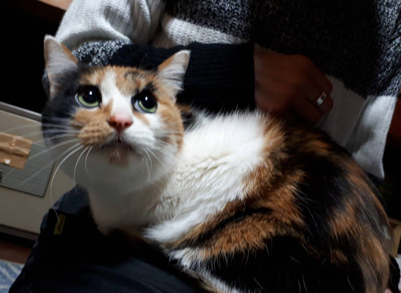 | 特徴(性格など) | はっきりとした色の美しい三毛猫さんです。 まつげエクステしたような顔! 甘えん坊で膝乗りするけれど、高飛車な女王様です。 エイズ・白血病共に陰性です。 |