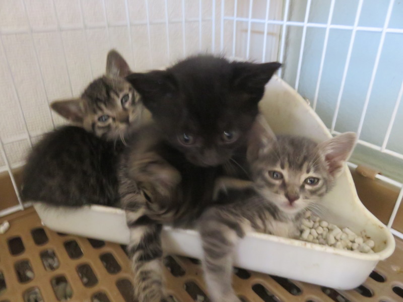 | 特徴(性格など) | キジトラ5匹、黒1匹。4/19時点で性別未確認。健康状態は特に問題無し。保護したときはさすがに怖かったようでシャーが少しありましたが、まだ小さいこともあり、保護後はすぐに慣れ、特に警戒心もなく兄弟全員仲良く子猫らしく活発に家中動き回っています。まだあまり構っていないので人馴れはこれからの接し方次第でどんどん慣れると思われます。 | ||